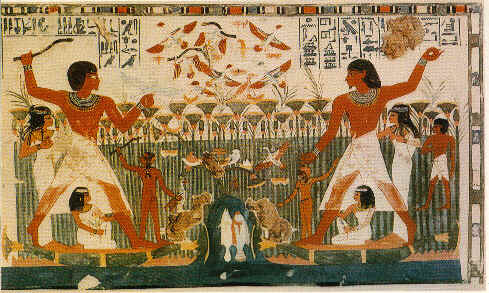 In this picture not only do you see what the painter sees, (the brothers hunting wild foul, papyrus reeds and a scatering flock in the backround) but we can also see what the painter knows is there i.e. the fish under the water.